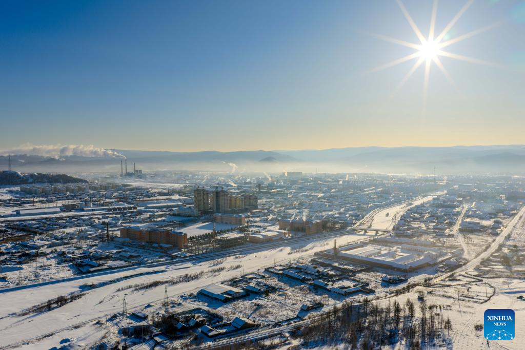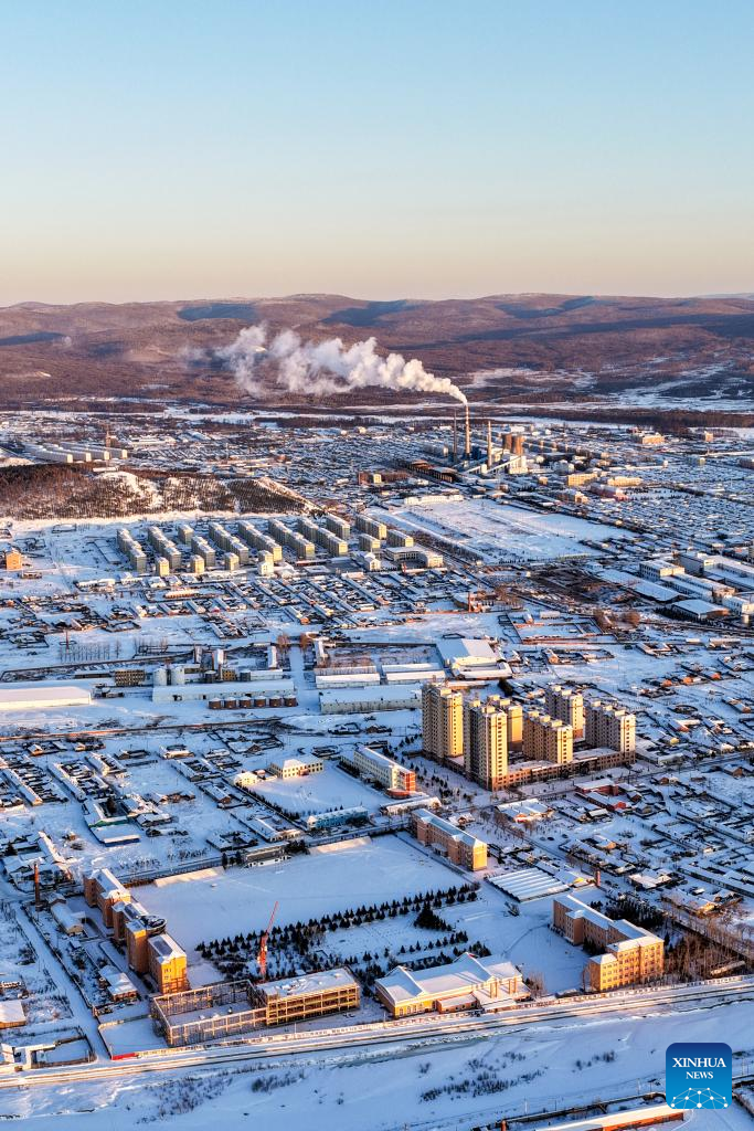 An aerial drone photo taken on Jan. 14, 2026 shows a view of Genhe City, north China's Inner Mongolia Autonomous Region. (Xinhua/Ma Jinrui)