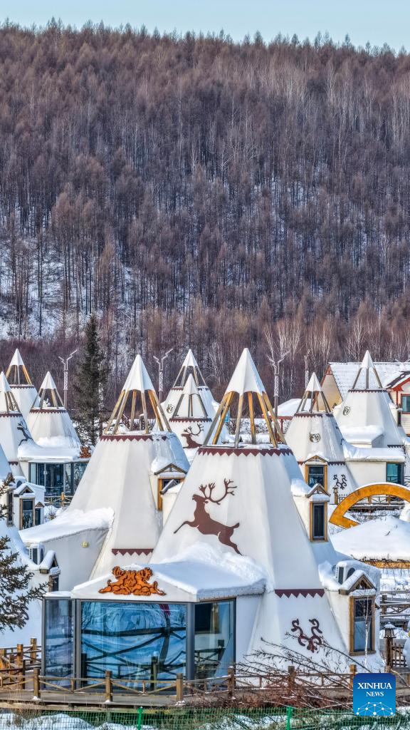 An aerial drone photo taken on Jan. 15, 2026 shows traditional Ewenki tents in Aoluguya Ewenki Township in Genhe, north China's Inner Mongolia Autonomous Region. (Xinhua/Ma Jinrui)
