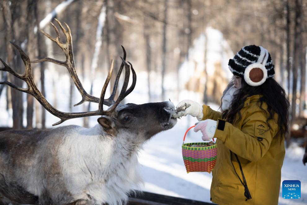 A tourist interacts with a reindeer at a scenic spot in Aoluguya Ewenki Township in Genhe, north China's Inner Mongolia Autonomous Region, Jan. 15, 2026. (Xinhua/Xu Jiayi)