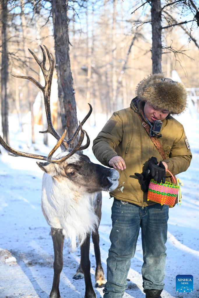 A tourist feeds a reindeer in Aoluguya Ewenki Township, Genhe, north China's Inner Mongolia Autonomous Region, Jan. 15, 2026. (Xinhua/Lian Zhen)
