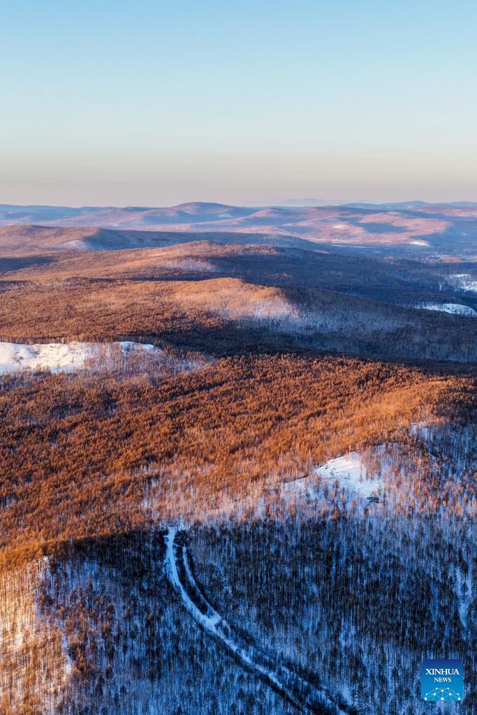 An aerial drone photo taken on Jan. 14, 2026 shows a view of a forest on the outskirts of Genhe, north China's Inner Mongolia Autonomous Region. (Xinhua/Lian Zhen)