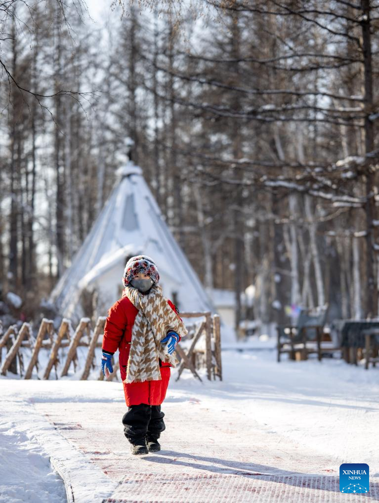 A young tourist is seen in Aoluguya Ewenki Township, Genhe, north China's Inner Mongolia Autonomous Region, Jan. 15, 2026. (Xinhua/Lian Zhen)