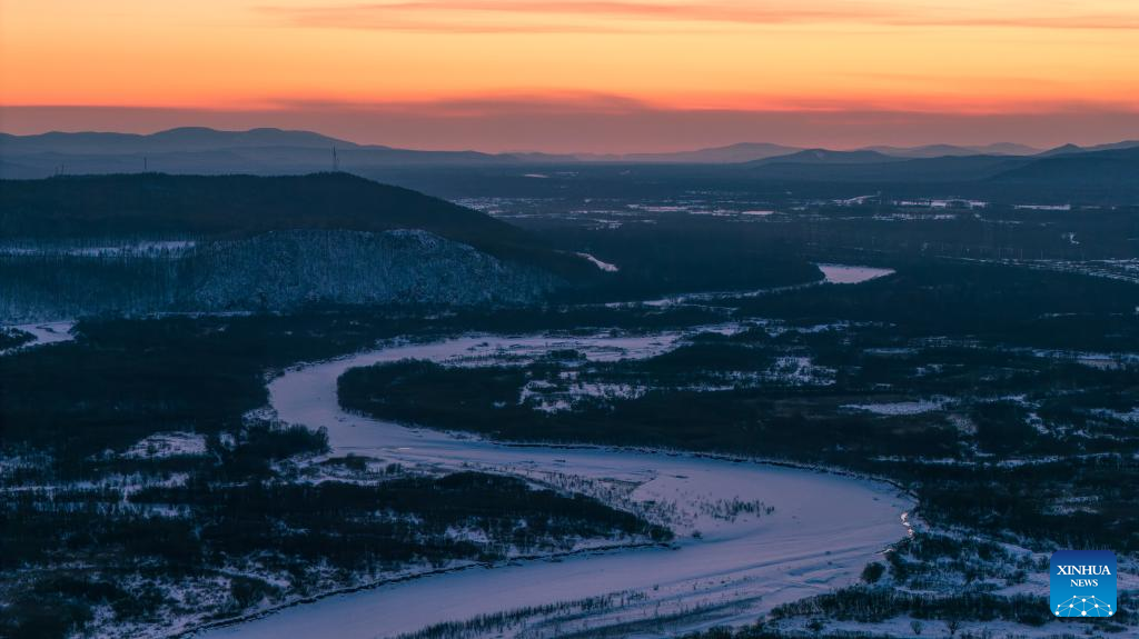 An aerial drone photo taken on Jan. 14, 2026 shows a view of the frozen Genhe River in Genhe, north China's Inner Mongolia Autonomous Region. (Xinhua/Ma Jinrui)