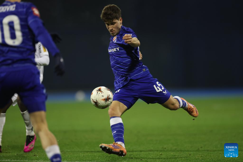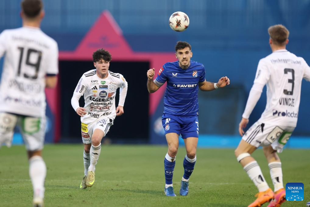 Bruno Goda (2nd R) of Dinamo Zagreb heads the ball during a friendly football match between GNK Dinamo Zagreb and TSV Hartberg in Zagreb, Croatia, on Jan. 15, 2026. (Photo by Slavko Midzor/PIXSELL via Xinhua)