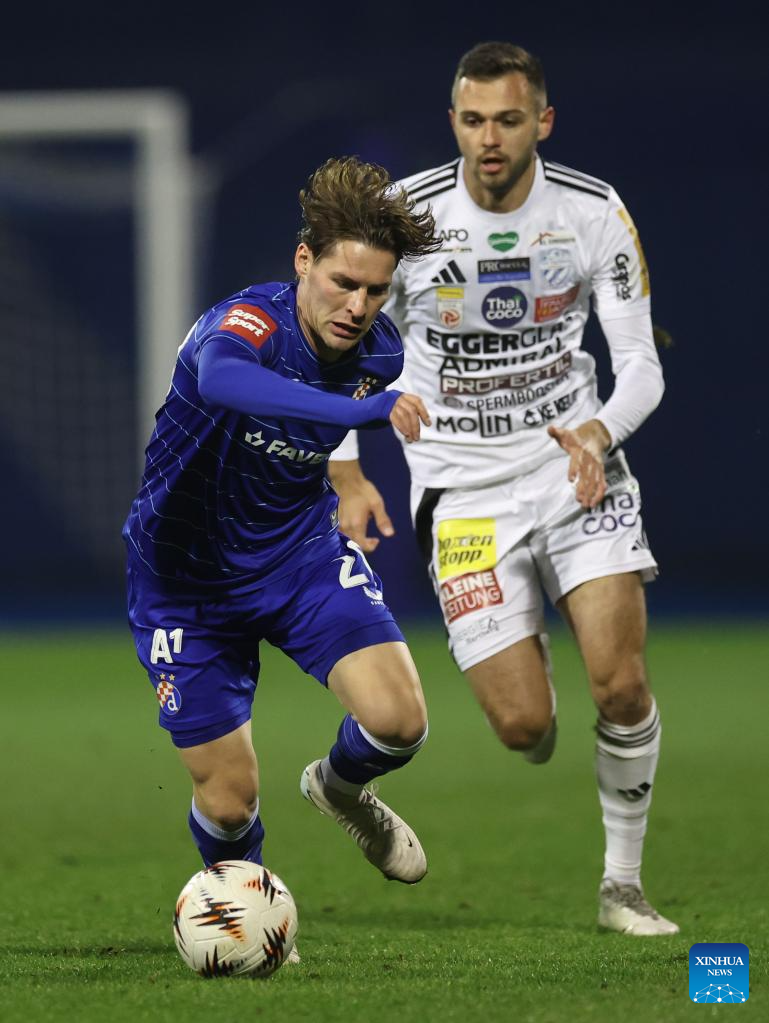 Robert Mudrazija (L) of Dinamo Zagreb vies the ball during a friendly football match between GNK Dinamo Zagreb and TSV Hartberg in Zagreb, Croatia, on Jan. 15, 2026. (Photo by Slavko Midzor/PIXSELL via Xinhua)