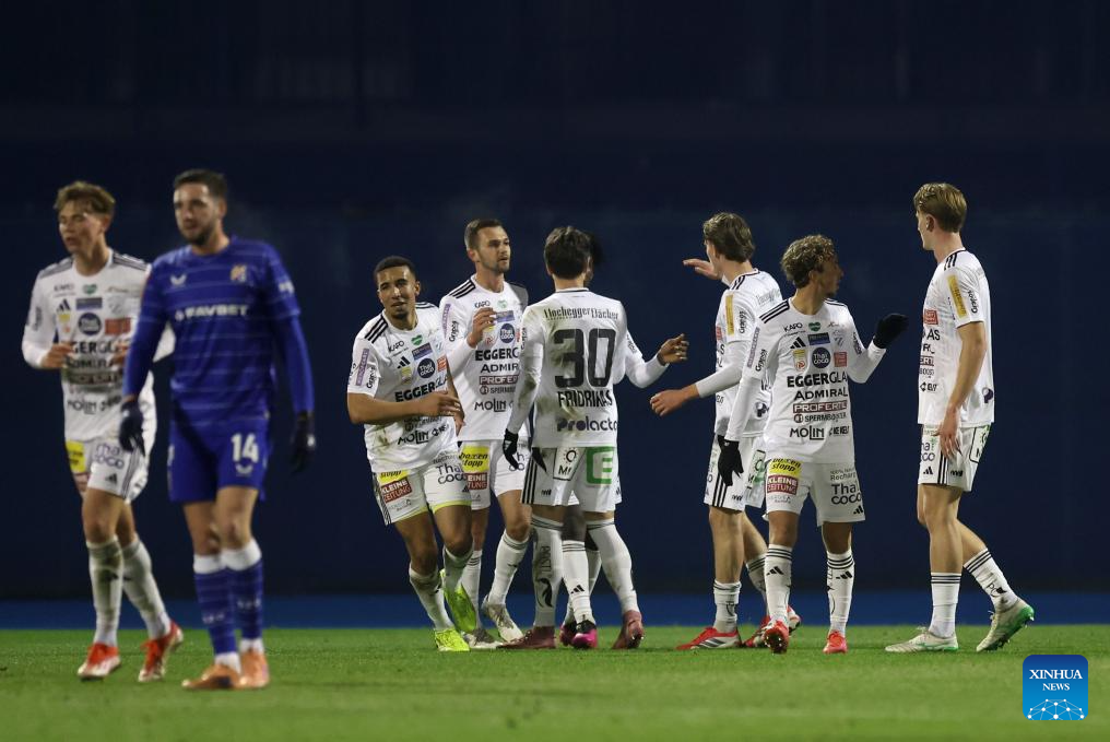 Players of TSV Hartberg celebrate a goal during a friendly football match between GNK Dinamo Zagreb and TSV Hartberg in Zagreb, Croatia, on Jan. 15, 2026. (Photo by Slavko Midzor/PIXSELL via Xinhua)