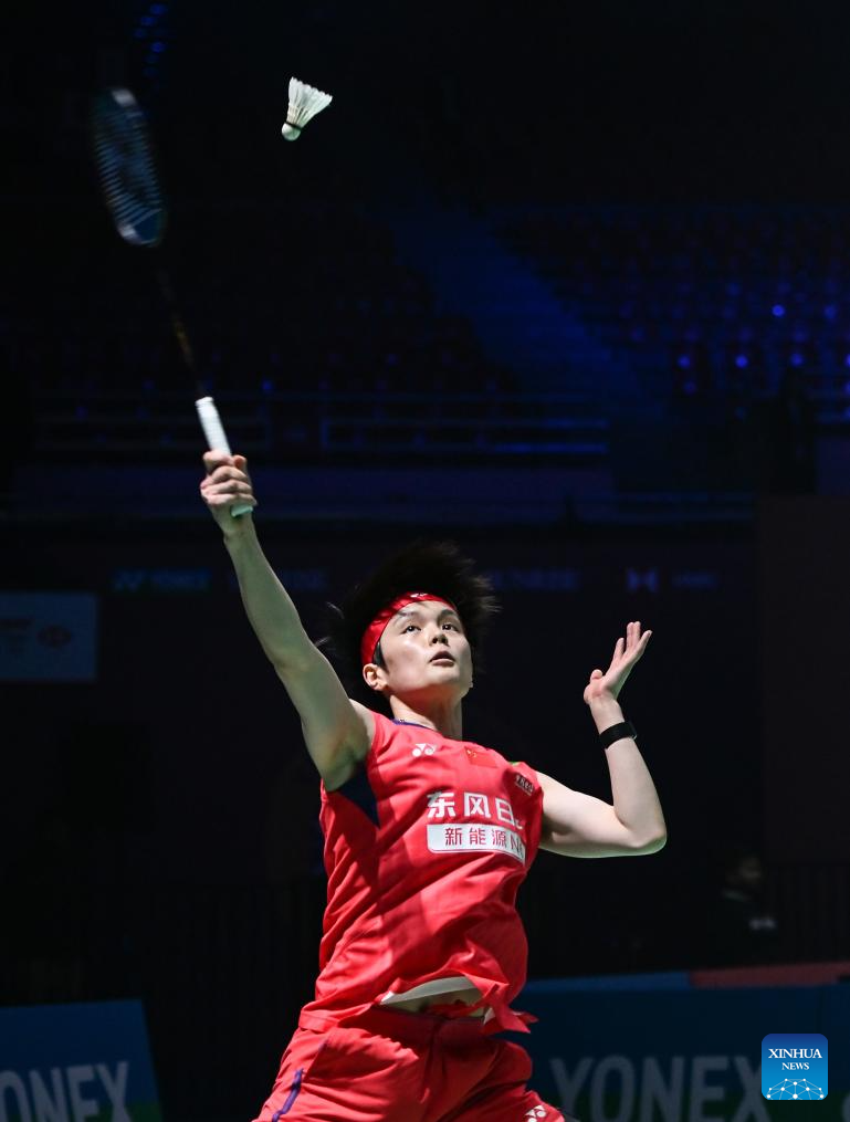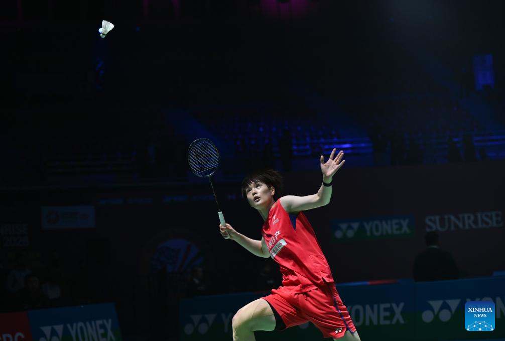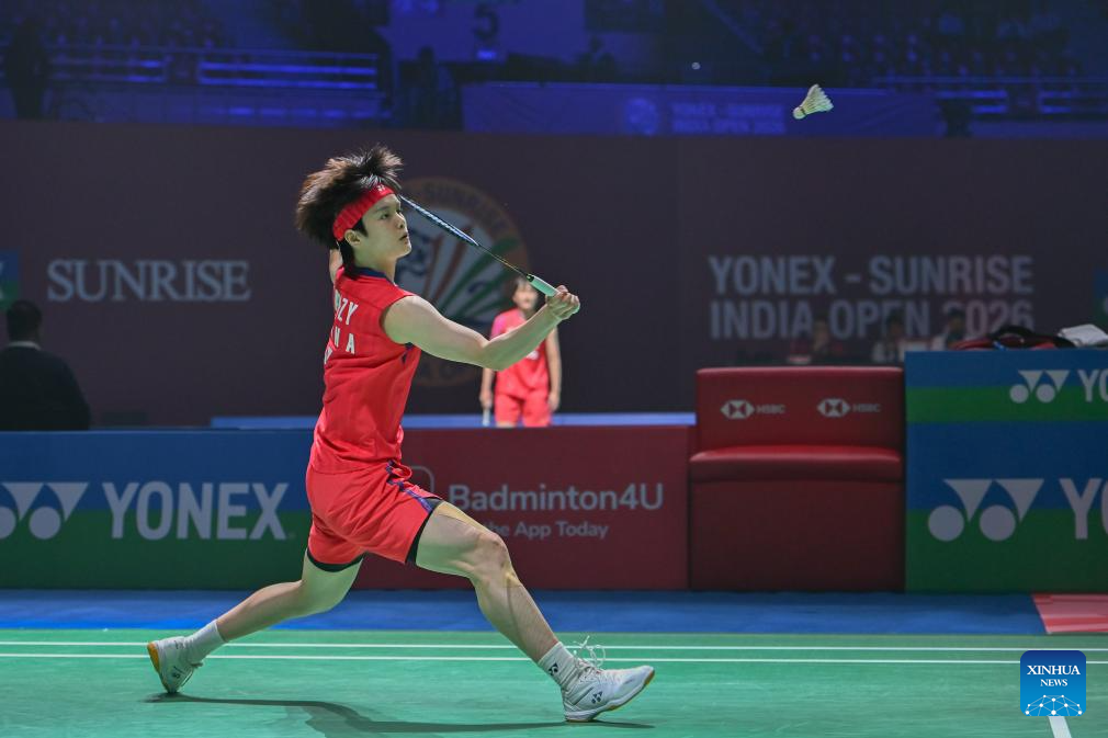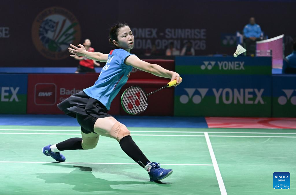 Wang Zhiyi of China competes against Nidaira Natsuki of Japan during women's singles quarter-final match at the India Open 2026 in New Delhi, India, Jan. 16, 2026. (Xinhua/Javed Dar)