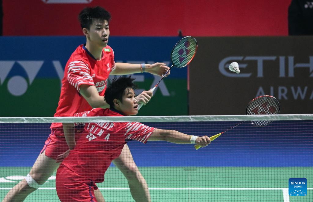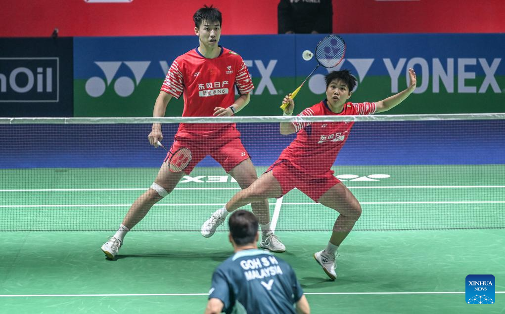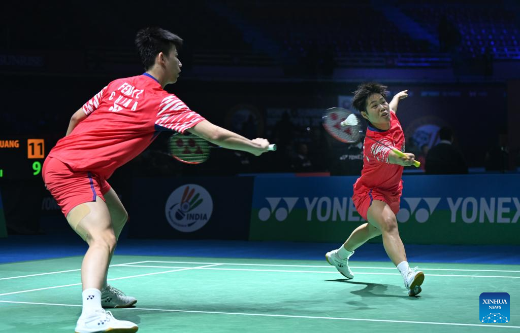 Huang Dongping (R)/Feng Yanzhe of China compete during mixed doubles quarter-final match against Goh Soon Huat/Lai Shevon Jemie of Malaysia at the India Open 2026 in New Delhi, India, Jan. 16, 2026. (Xinhua/Javed Dar)