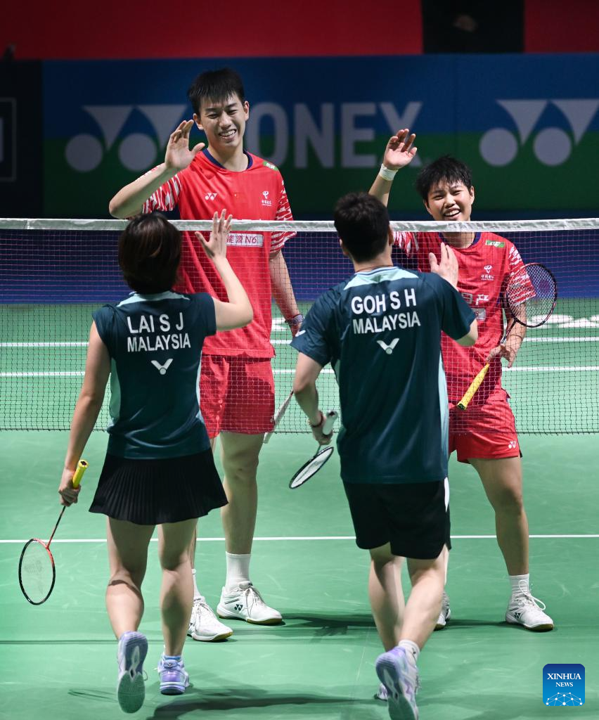 Goh Soon Huat (2nd R)/Lai Shevon Jemie (1st L) of Malaysia greet Huang Dongping (1st R)/Feng Yanzhe of China after mixed doubles quarter-final match at the India Open 2026 in New Delhi, India, Jan. 16, 2026. (Xinhua/Javed Dar)