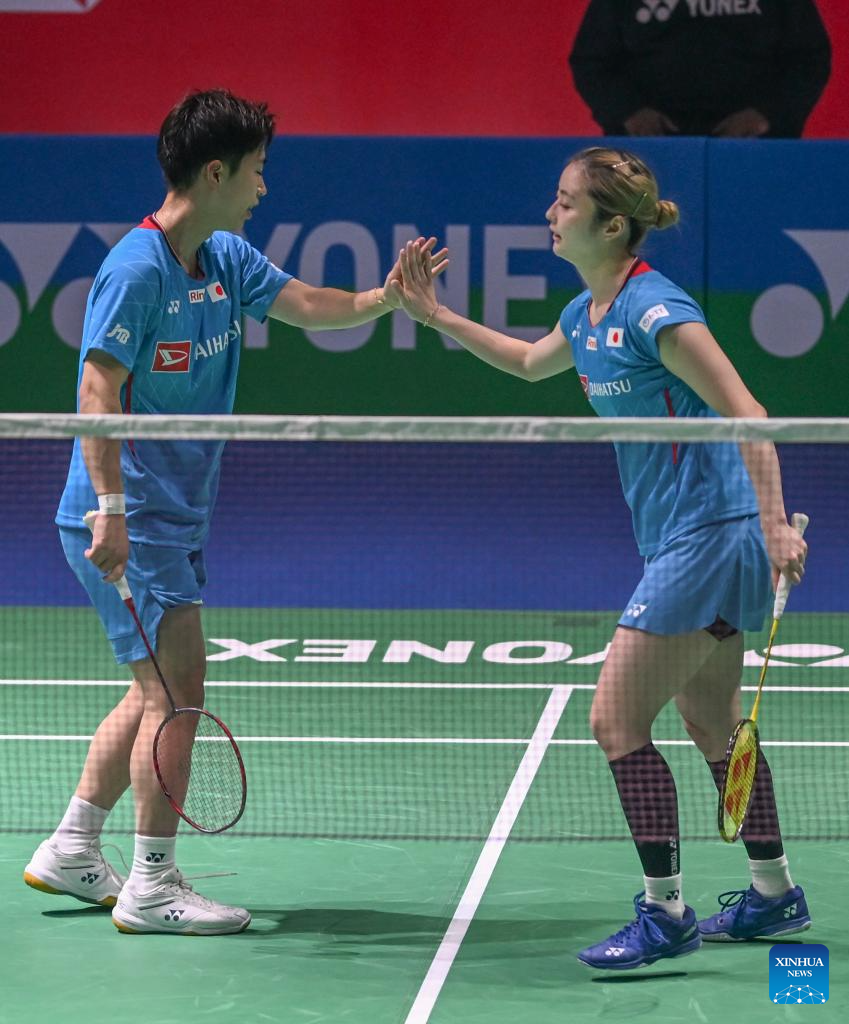 Japan's Shimogami Yuichi (L) /Hobara Sayaka celebrate after winning a point during the mixed doubles quarter final match against China's Jiang Zhenbang/Wei Yaxin at the India Open 2026 in New Delhi, India, Jan. 16, 2026. (Xinhua/Javed Dar)