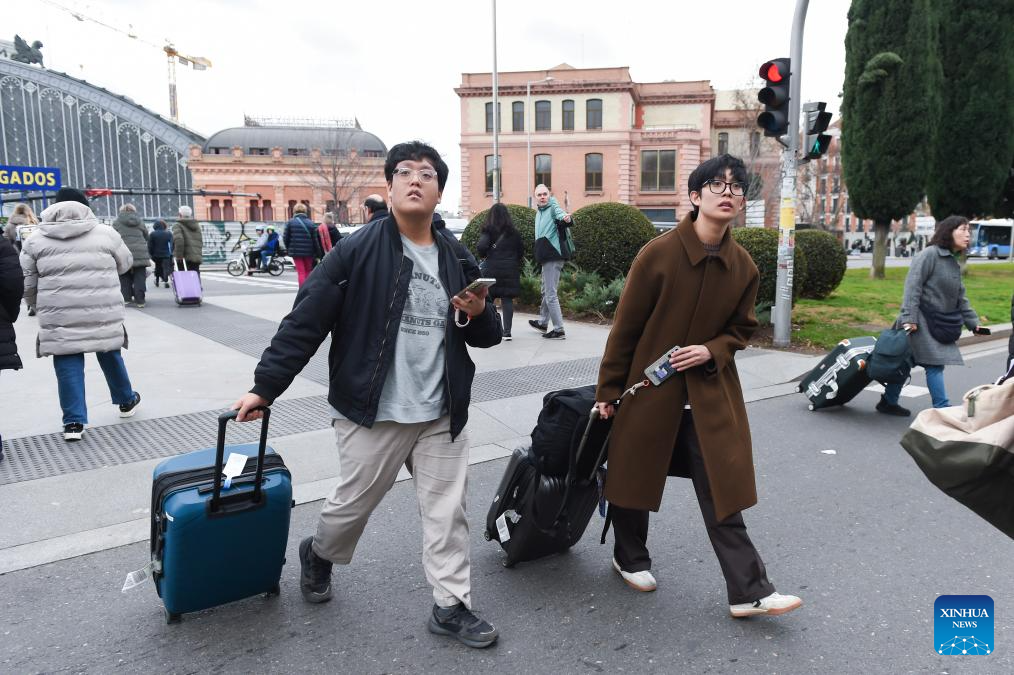 Two men walking with their luggage are pictured in Madrid, Spain, on Jan. 15, 2026. A total of 97 million foreign tourists visited Spain in 2025, setting a new all-time record for international visitors to the country, Spanish Minister of Industry and Tourism Jordi Hereu announced on Thursday. (Photo by Gustavo Valiente/Xinhua)