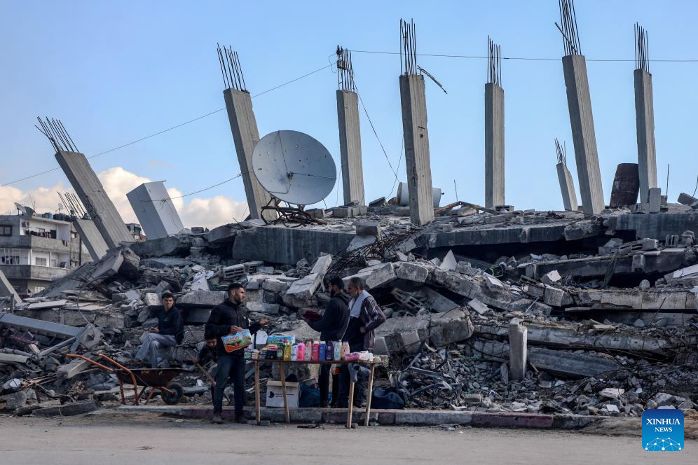 Photo taken on Jan. 15, 2026 shows a vendor near damaged buildings in Gaza City. (Photo by Rizek Abdeljawad/Xinhua)