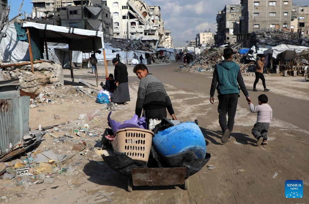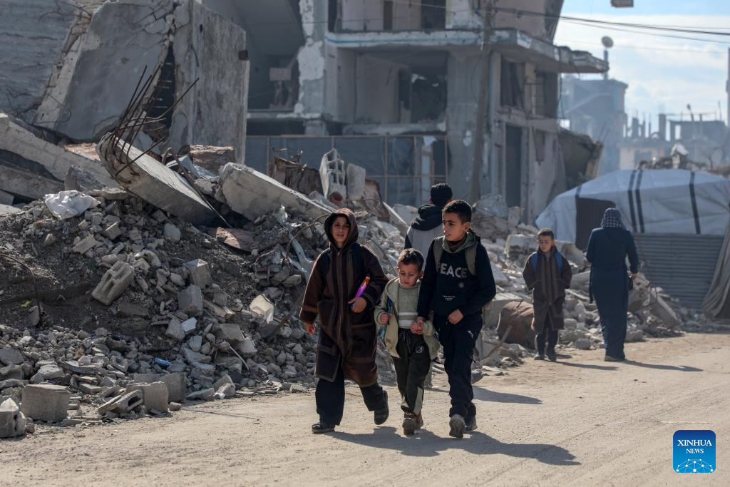 Children walk among rubble in Gaza City, Jan. 15, 2026. (Photo by Rizek Abdeljawad/Xinhua)