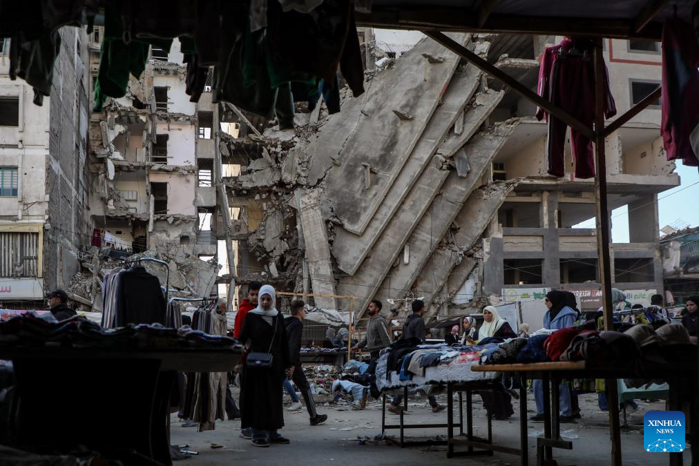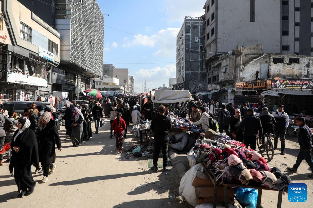 Photo taken on Jan. 15, 2026 shows people walking in a market in Gaza City. (Photo by Rizek Abdeljawad/Xinhua)