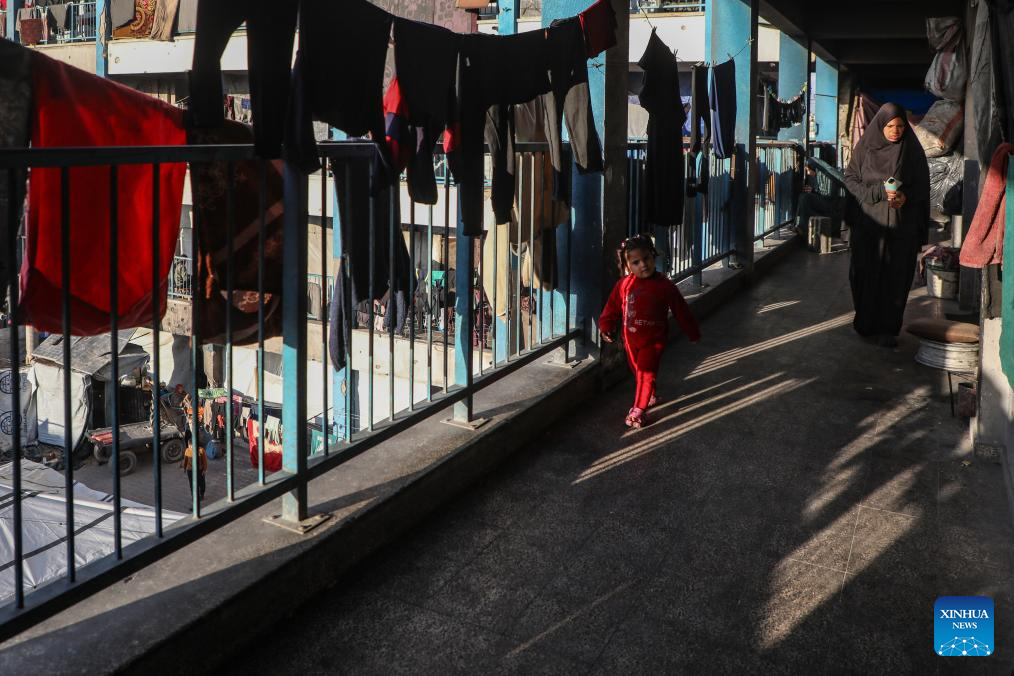 Photo taken on Jan. 15, 2026 shows a child in a shelter in Gaza City. (Photo by Rizek Abdeljawad/Xinhua)