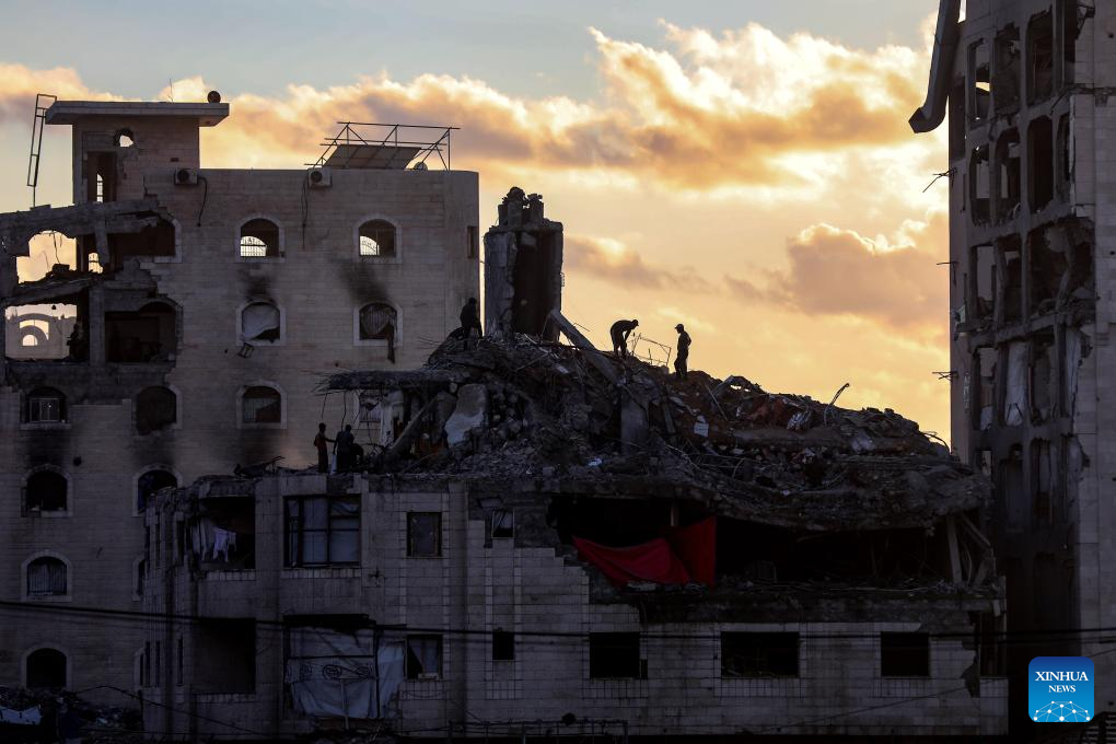 People inspect rubble in Gaza City, Jan. 15, 2026. (Photo by Rizek Abdeljawad/Xinhua)