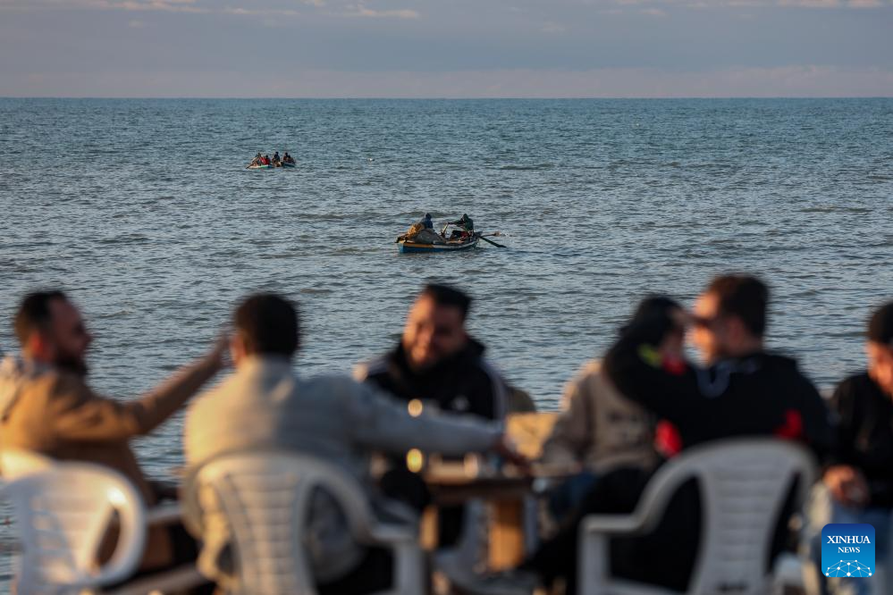 Palestinians spend time on a beach in Gaza City at sunset, Jan. 16, 2026. (Photo by Rizek Abdeljawad/Xinhua)