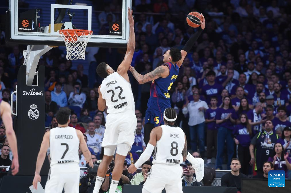 Real Madrid's Walter Tavares (top L) vies with FC Barcelona's Miles Norris (top R) during the Euroleague basketball match between Real Madrid and FC Barcelona in Madrid, Spain, on Jan. 16, 2026. (Photo by Gustavo Valiente/Xinhua)