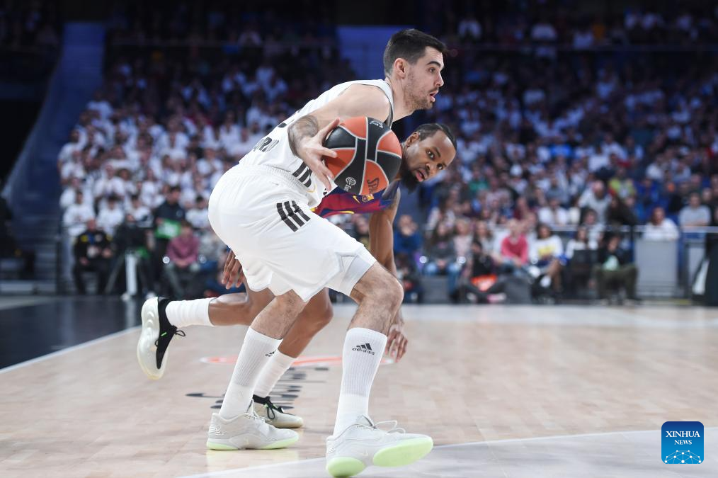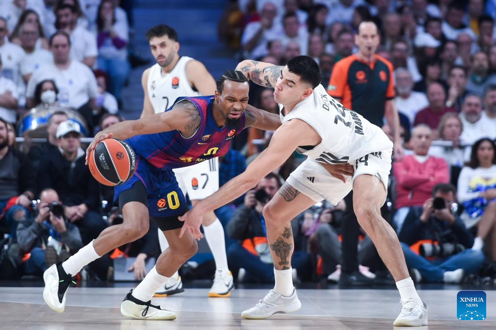 Real Madrid's Alberto Abalde (front) vies with FC Barcelona's Kevin Punter during the Euroleague basketball match between Real Madrid and FC Barcelona in Madrid, Spain, on Jan. 16, 2026. (Photo by Gustavo Valiente/Xinhua)