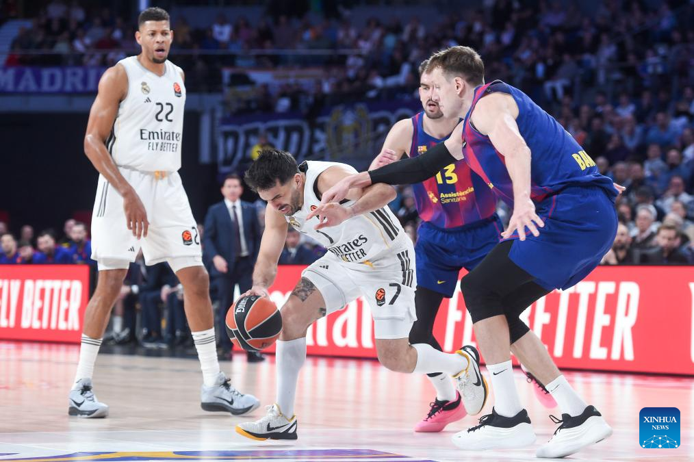 Real Madrid's Facundo Campazzo (2nd L) vies with FC Barcelona's Jan Vesely (1st R) during the Euroleague basketball match between Real Madrid and FC Barcelona in Madrid, Spain, on Jan. 16, 2026. (Photo by Gustavo Valiente/Xinhua)