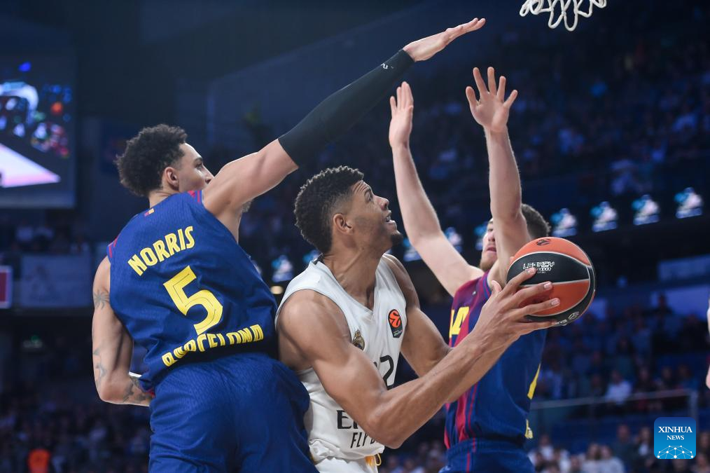 Real Madrid's Walter Tavares (C) vies with FC Barcelona's Miles Norris (L) during the Euroleague basketball match between Real Madrid and FC Barcelona in Madrid, Spain, on Jan. 16, 2026. (Photo by Gustavo Valiente/Xinhua)