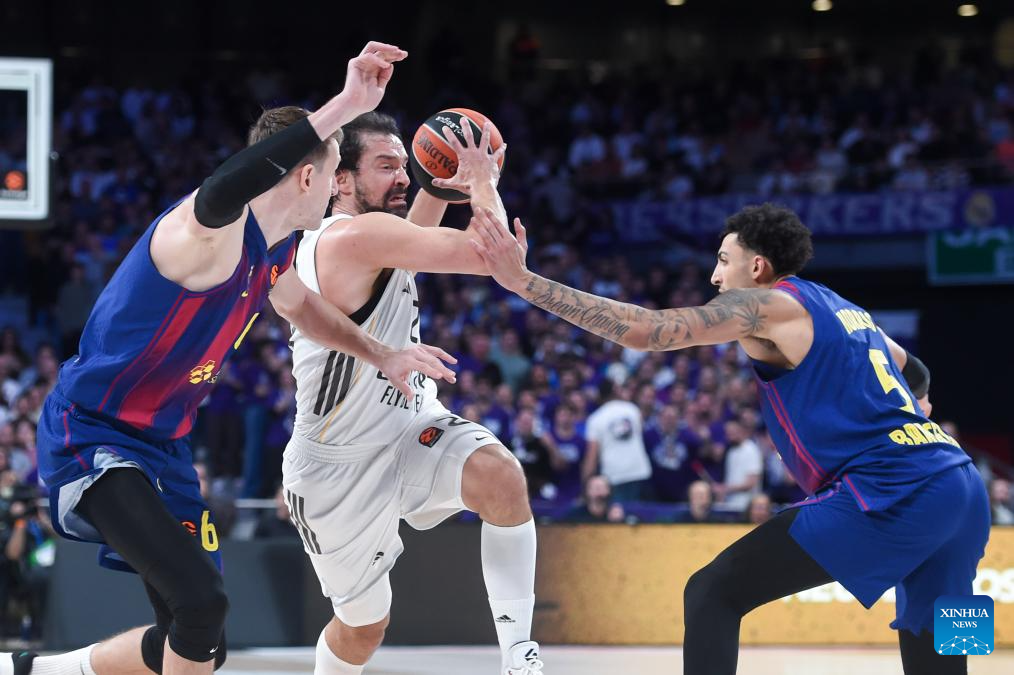 Real Madrid's Sergio Llull (C) vies with FC Barcelona's Jan Vesely (L) and Miles Norris during the Euroleague basketball match between Real Madrid and FC Barcelona in Madrid, Spain, on Jan. 16, 2026. (Photo by Gustavo Valiente/Xinhua)