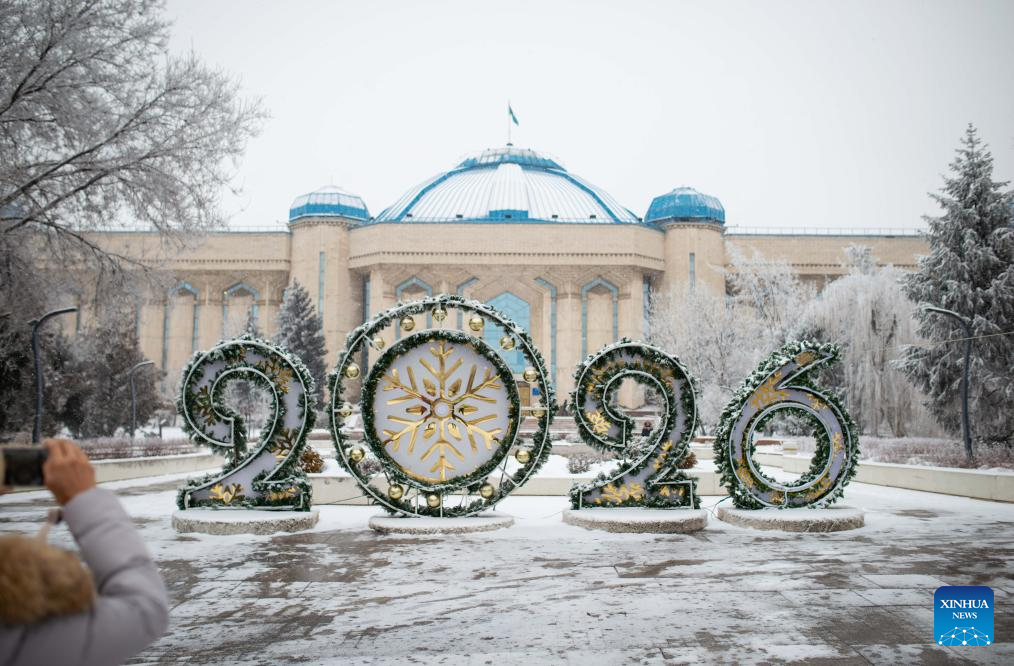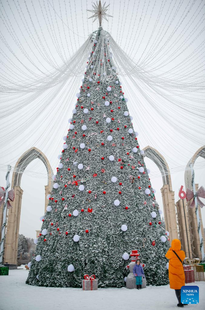 People take photos with a snow-covered Christmas tree on a square in downtown Almaty, Kazakhstan, on Jan. 16, 2026. (Xinhua/Li Renzi)
