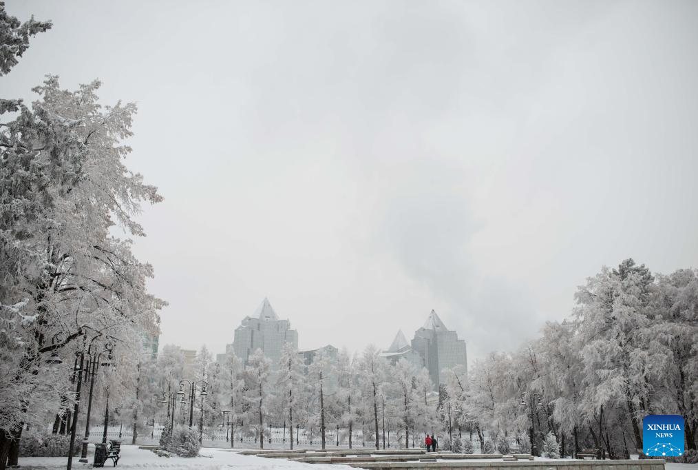 This photo taken on Jan. 16, 2026 shows the snow scenery in downtown Almaty, Kazakhstan. (Xinhua/Li Renzi)
