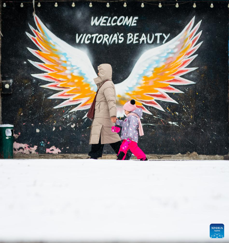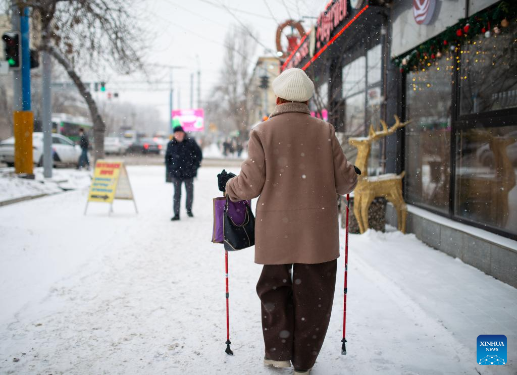 A pedestrian walks amid snowfall on a street in downtown Almaty, Kazakhstan, on Jan. 16, 2026. (Xinhua/Li Renzi)