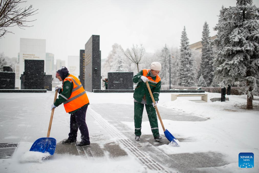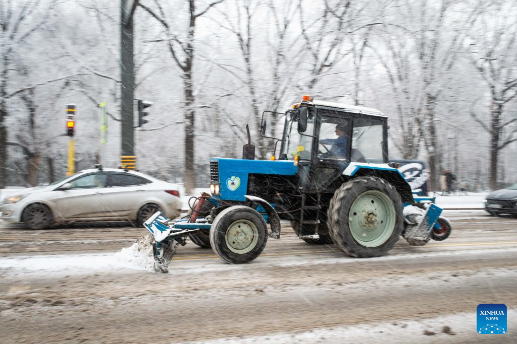 Municipal workers clear snow in downtown Almaty, Kazakhstan, on Jan. 16, 2026. (Xinhua/Li Renzi)