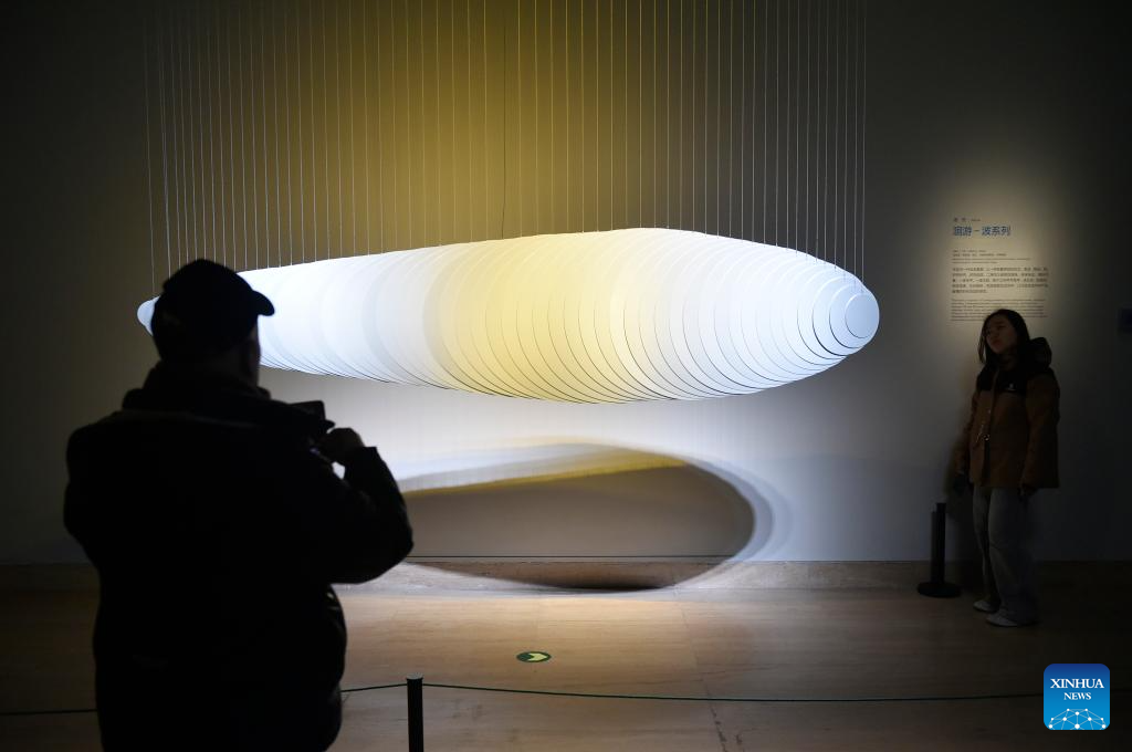 A visitor visits the exhibition "Future Poetics, Digital Traces and Intended Blank -- New Expressions of Technical Art" at the National Art Museum of China, in Beijing, capital of China, Jan. 16, 2026. The exhibition unveiled in Beijing on Friday, featuring works from eight contemporary young artists, showcasing their exploratory achievements in integrating technological elements into artistic creation.