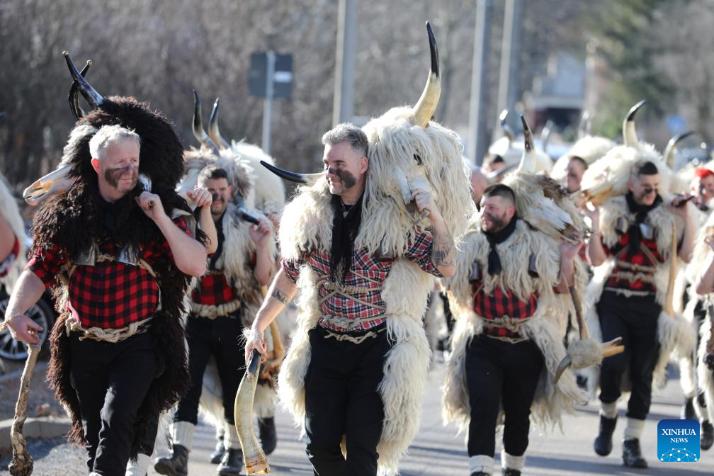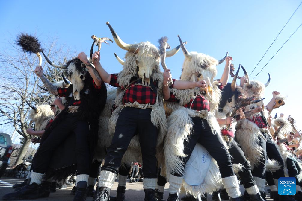 People in traditional costumes take part in the bell ringers' parade in Grobnik, Croatia, on Jan. 17, 2026. The event is a Croatian tradition to drive out evil spirits over the winter months and to usher in the start of spring. (Goran Kovacic/PIXSELL via Xinhua)