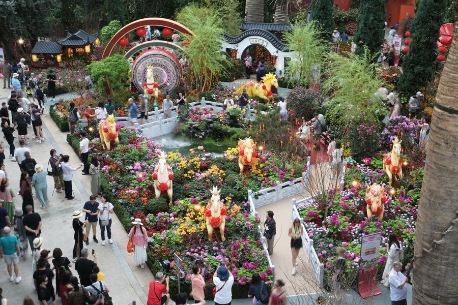 Created in China and inspired by an ancient classical ink painting of eight steeds in full gallop, the horses anchor Spring Blossoms: Gallop into Prosperity, a Chinese New Year floral exhibition that opened on Friday at the park. Running through March 1 inside the Flower Dome, a 1.2-hectare glass conservatory, the show brings together more than 10,000 plants, carefully arranged for the exhibition.