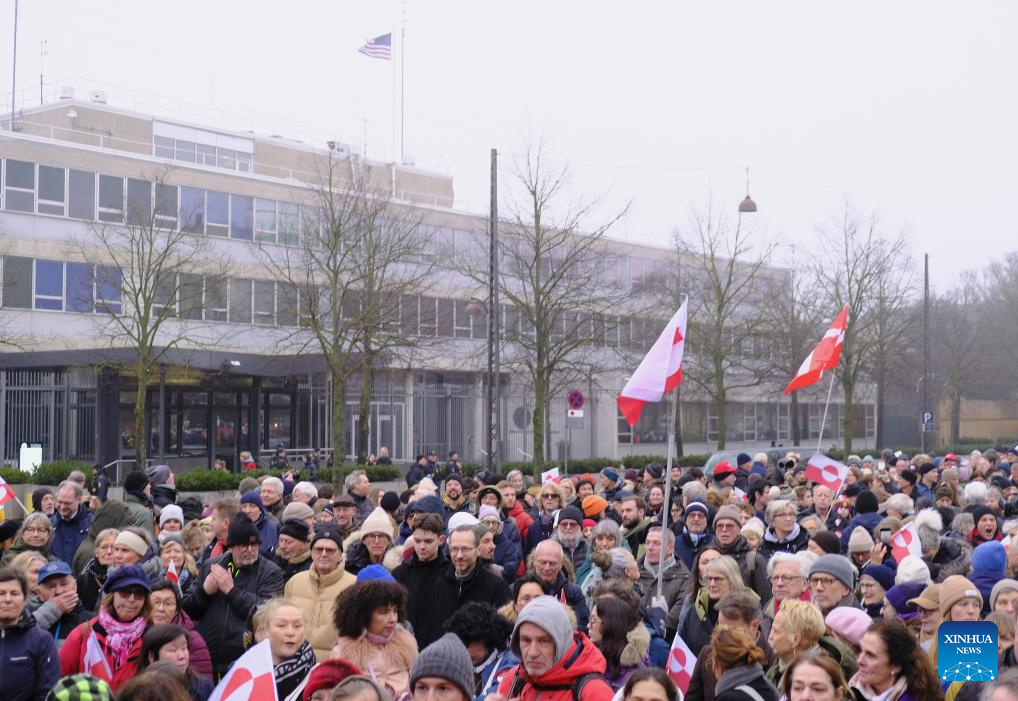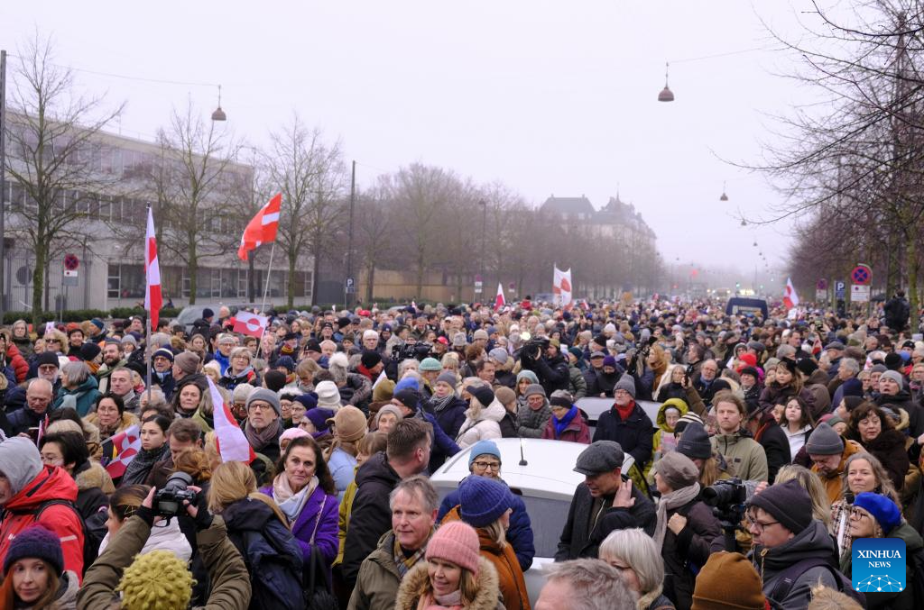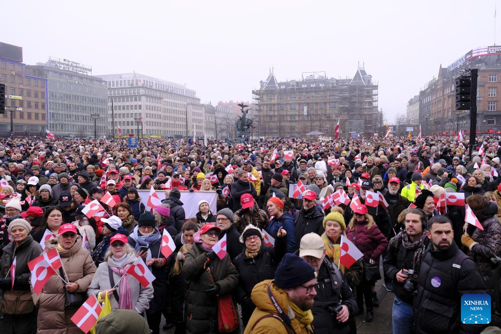 COPENHAGEN, Jan. 17 (Xinhua) -- By Saturday noon, thousands had gathered in central Copenhagen, bundled against the January cold, as Danish and Greenlandic flags rippled overhead and chants of "Greenland is not for sale" and "Hands off Greenland" echoed through the crowd in protest against U.S. actions and remarks suggesting control over the island.