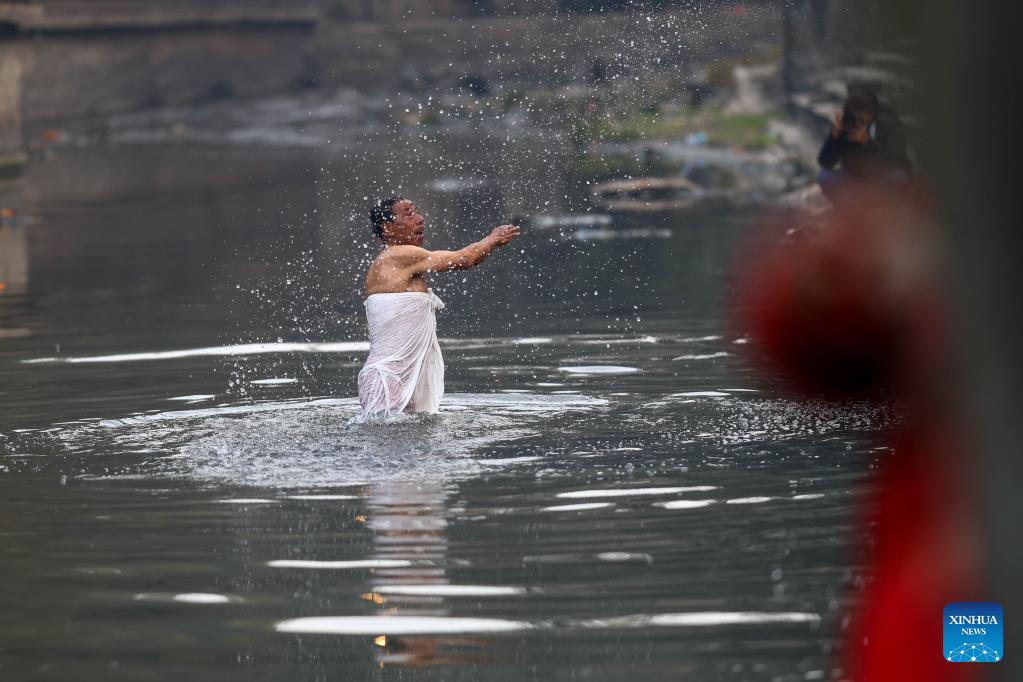 A devotee performs a ritual in the Bagmati River during the month-long Madhav Narayan Festival in Kathmandu, Nepal, Jan. 18, 2026. The festival is observed through fasting and praying to Goddess Swasthani and God Madhav Narayan. (Photo by Sulav Shrestha/Xinhua)