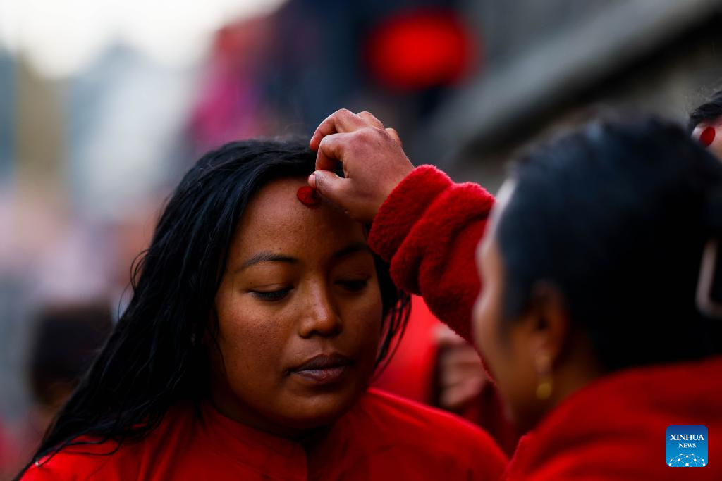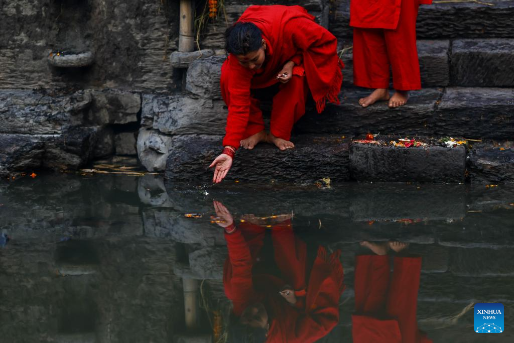 A devotee performs a ritual during the month-long Madhav Narayan Festival at Pashupatinath Temple in Kathmandu, Nepal, Jan. 18, 2026. The festival is observed through fasting and praying to Goddess Swasthani and God Madhav Narayan. (Photo by Sulav Shrestha/Xinhua)