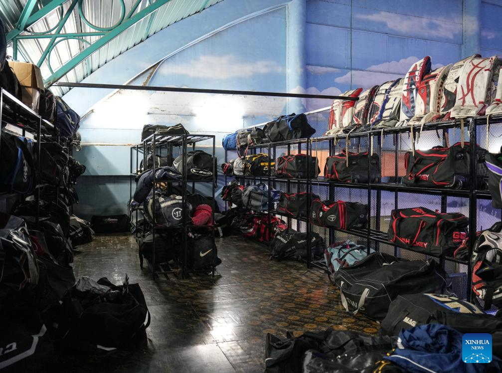 Kenya's national ice hockey team goalkeeper Tyson Michael sorts team equipment at the rink in Nairobi, Kenya on Nov. 22, 2025. (Xinhua/Li Yahui)