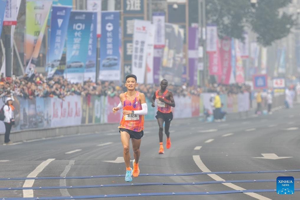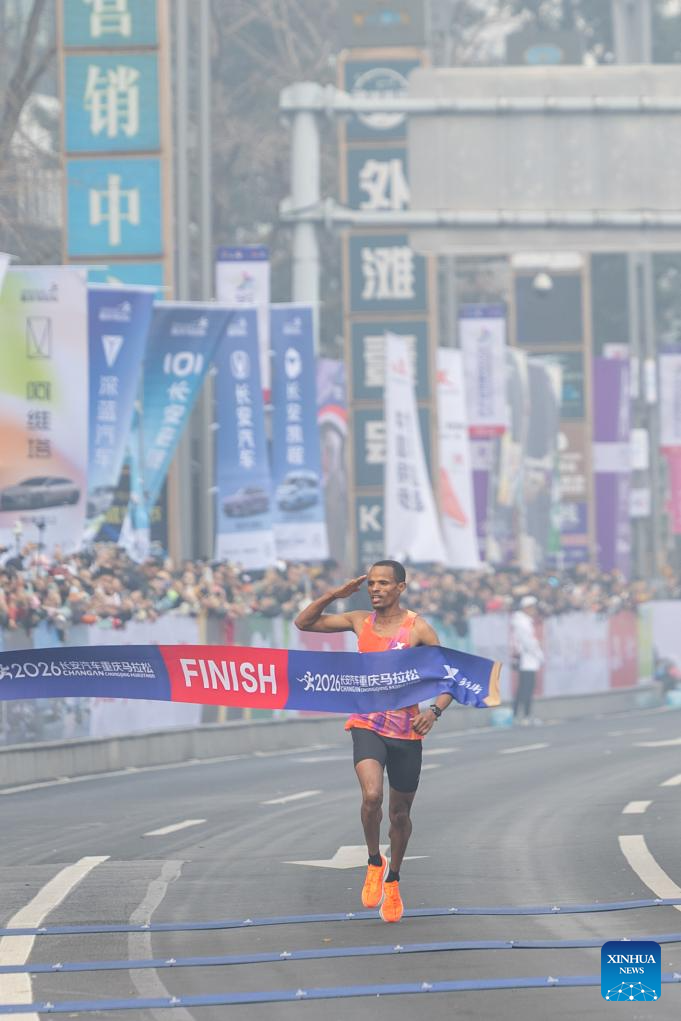 Adisu Tesfahun Tafere of Ethiopia crosses the finishing line and crowns the men's title during the Chongqing Marathon 2026 in Nan'an District of Chongqing Municipality, southwest China, Jan. 18, 2026. Some 25 thousand runners took part in this sport event here on Sunday. (Xinhua/Huang Wei)