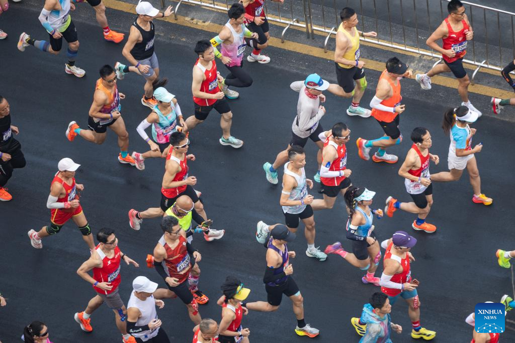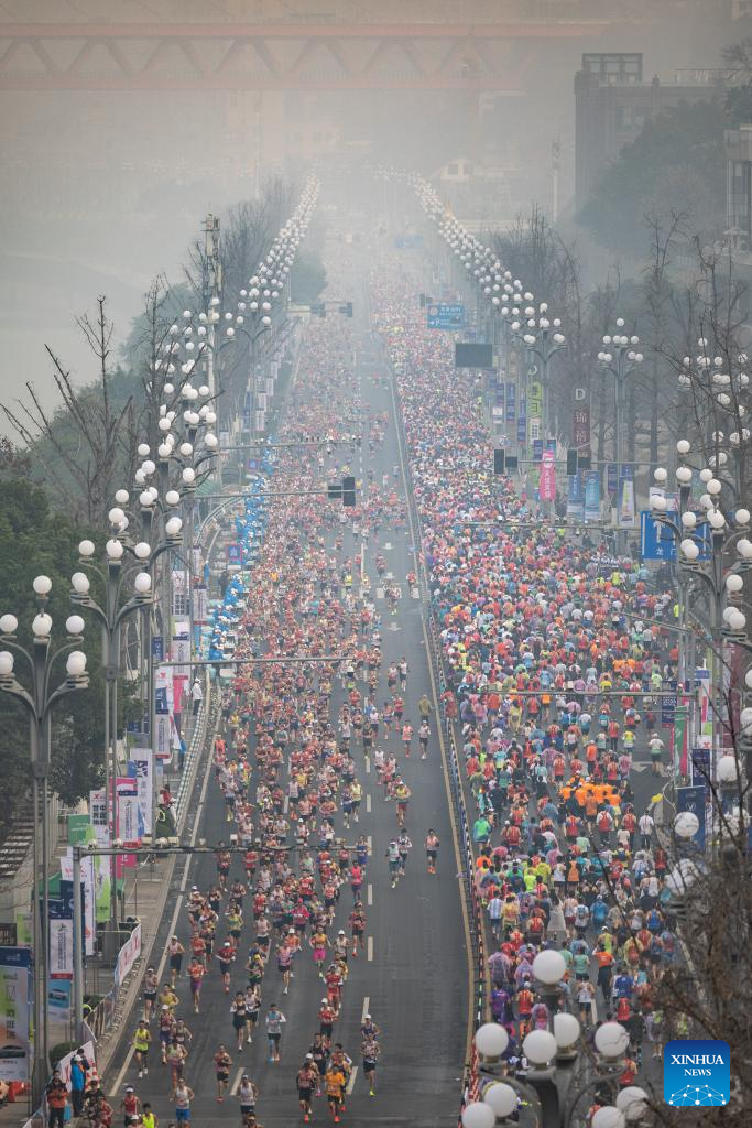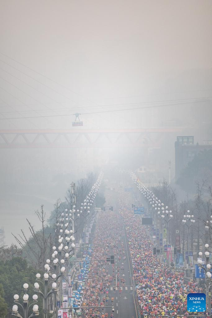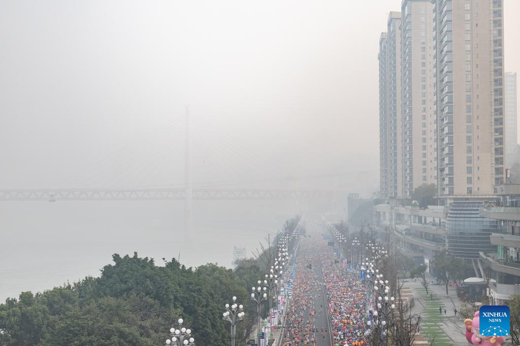Competitors run during the Chongqing Marathon 2026 in Nan'an District of Chongqing Municipality, southwest China, Jan. 18, 2026. Some 25 thousand runners took part in this sport event here on Sunday. (Xinhua/Huang Wei)