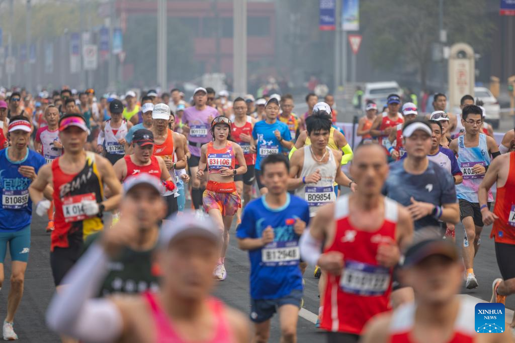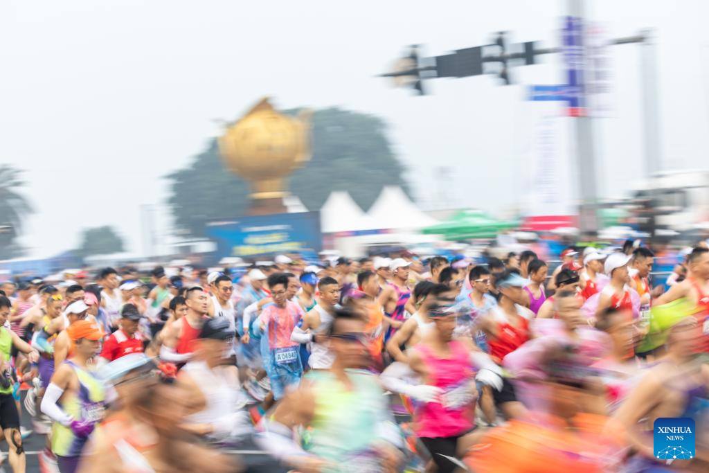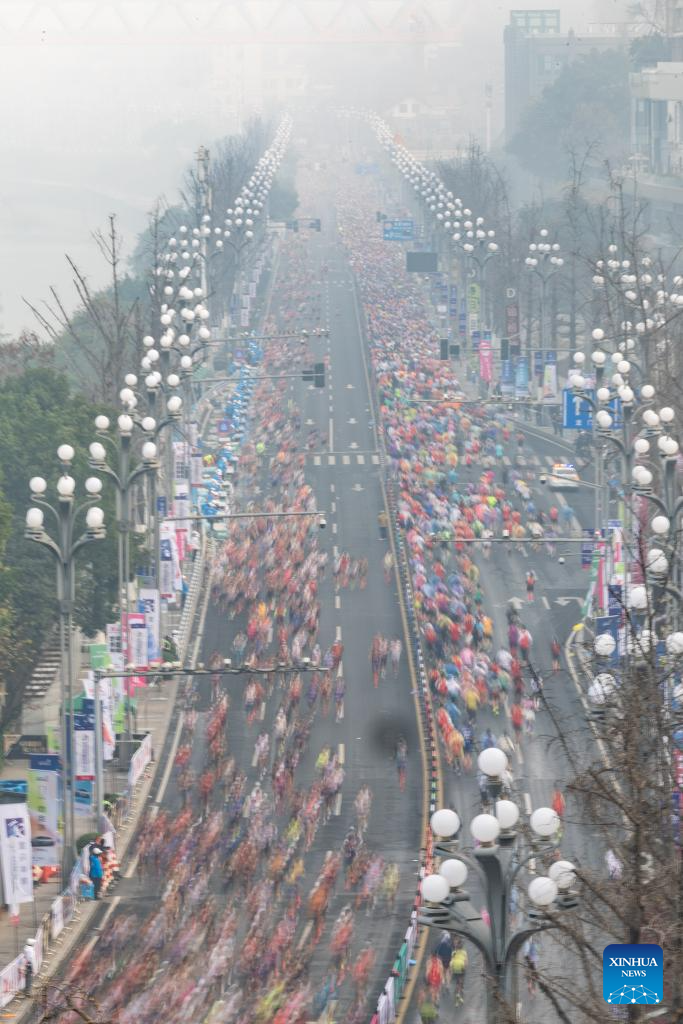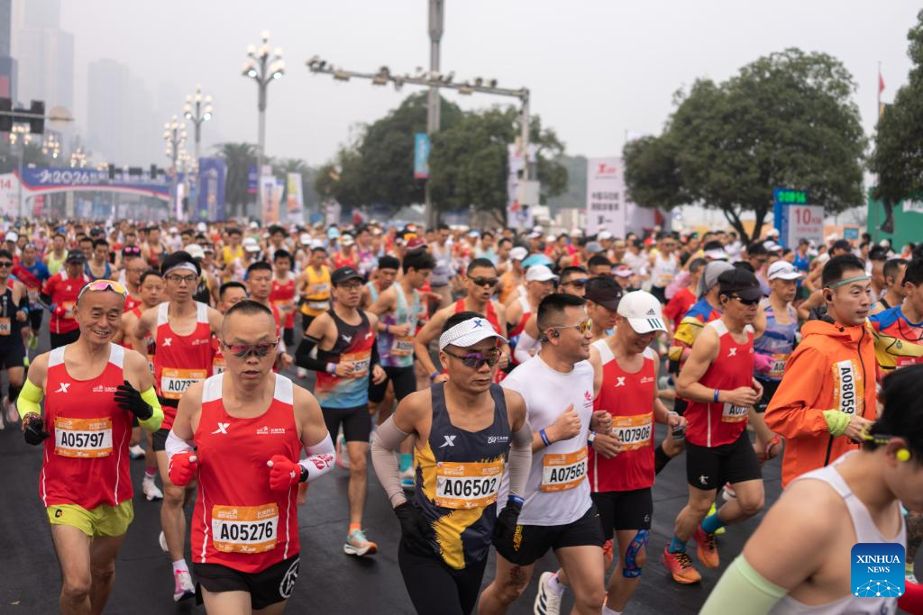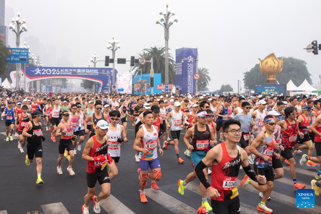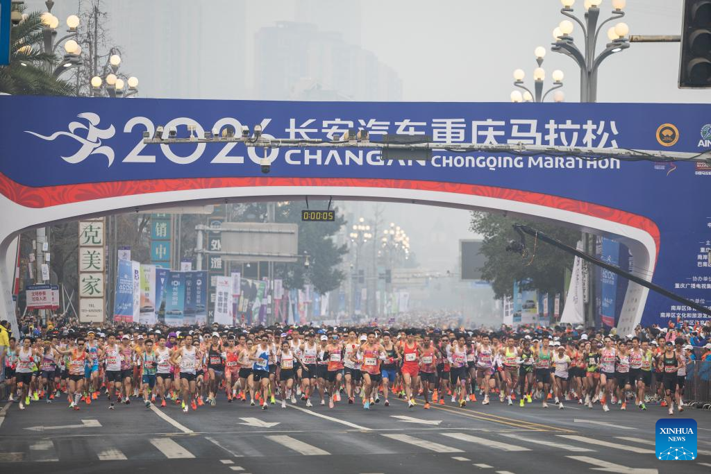 Runners set off from the starting line during the Chongqing Marathon 2026 in Nan'an District of Chongqing Municipality, southwest China, Jan. 18, 2026. Some 25 thousand runners took part in this sport event here on Sunday. (Xinhua/Huang Wei)