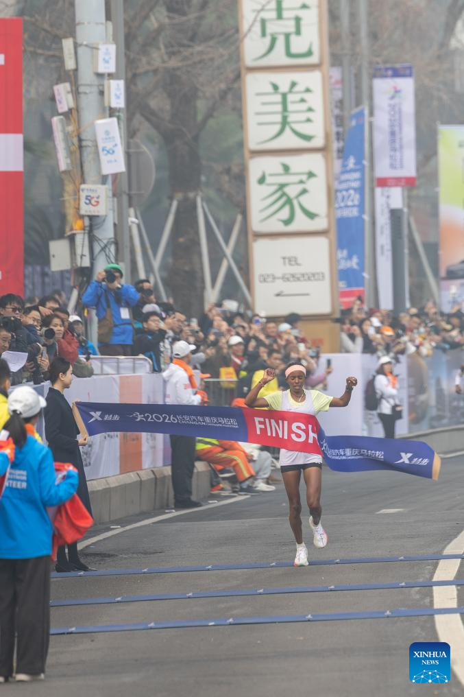 Kebebush Yisma Zewoldemariam of Ethiopia crosses the finishing line and crowns the women's title during the Chongqing Marathon 2026 in Nan'an District of Chongqing Municipality, southwest China, Jan. 18, 2026. Some 25 thousand runners took part in this sport event here on Sunday. (Xinhua/Huang Wei)