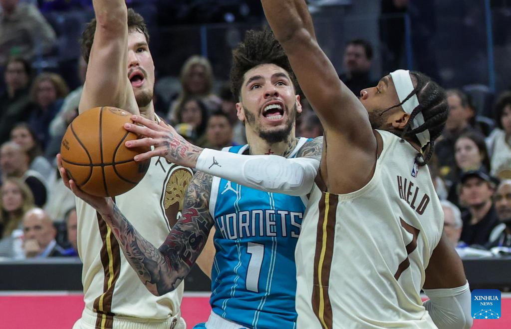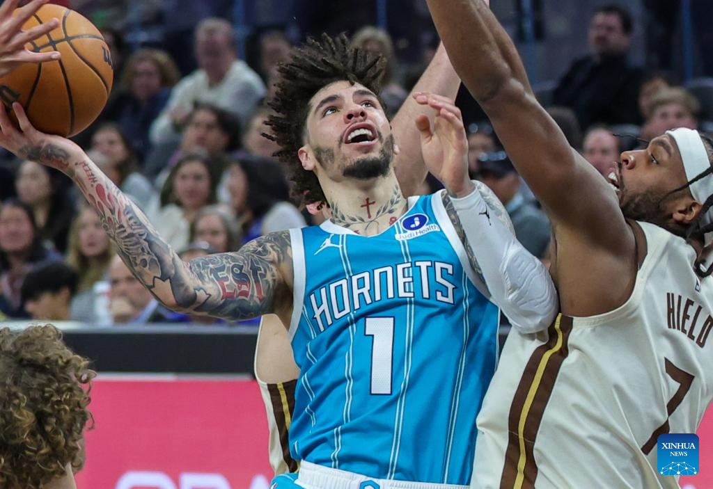 Charlotte Hornets' Lamelo Ball (C) competes during the 2025-2026 NBA regular season basketball game between Golden State Warriors and Charlotte Hornets in San Francisco, the United States, Jan. 17, 2026. (Photo by Dong Xudong/Xinhua)