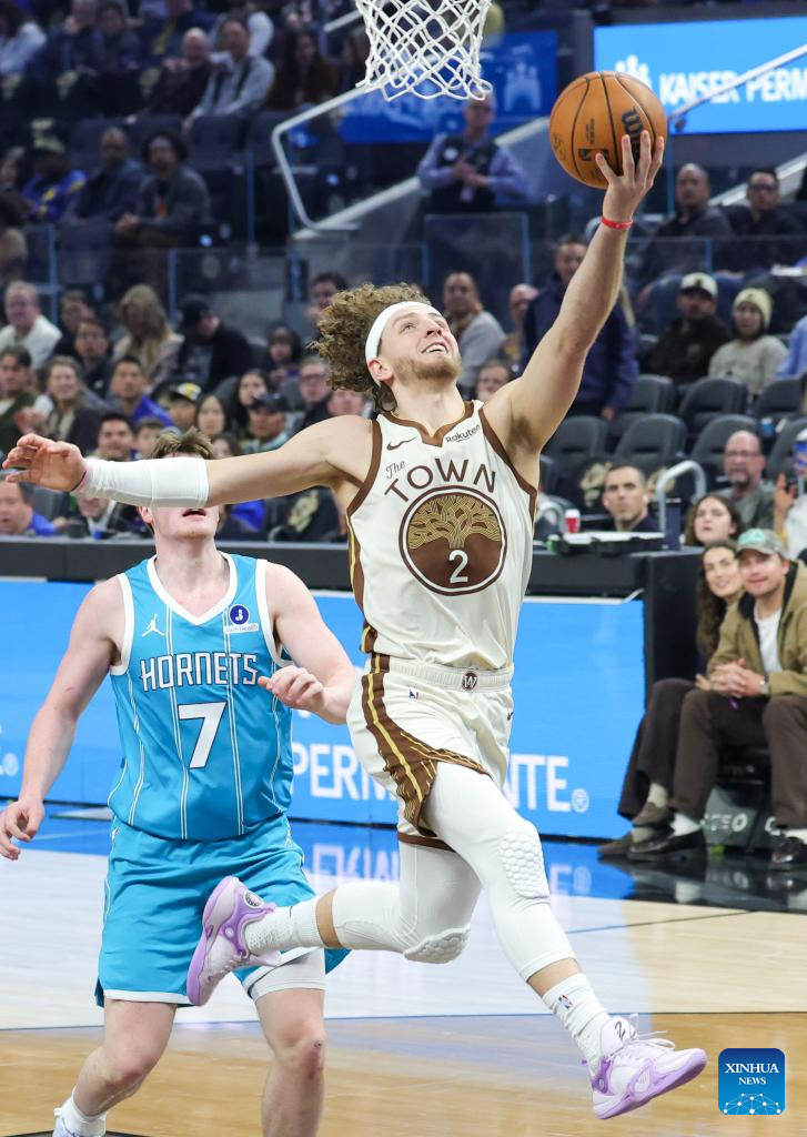 Golden State Warriors' Brandin Podziemski (R) goes for a layup during the 2025-2026 NBA regular season basketball game between Golden State Warriors and Charlotte Hornets in San Francisco, the United States, Jan. 17, 2026. (Photo by Dong Xudong/Xinhua)