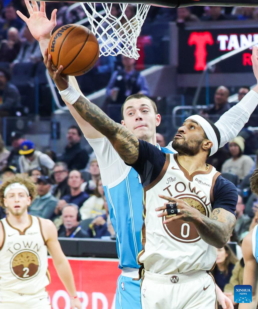 Golden State Warriors' Gary Payton II (R) competes during the 2025-2026 NBA regular season basketball game between Golden State Warriors and Charlotte Hornets in San Francisco, the United States, Jan. 17, 2026. (Photo by Dong Xudong/Xinhua)