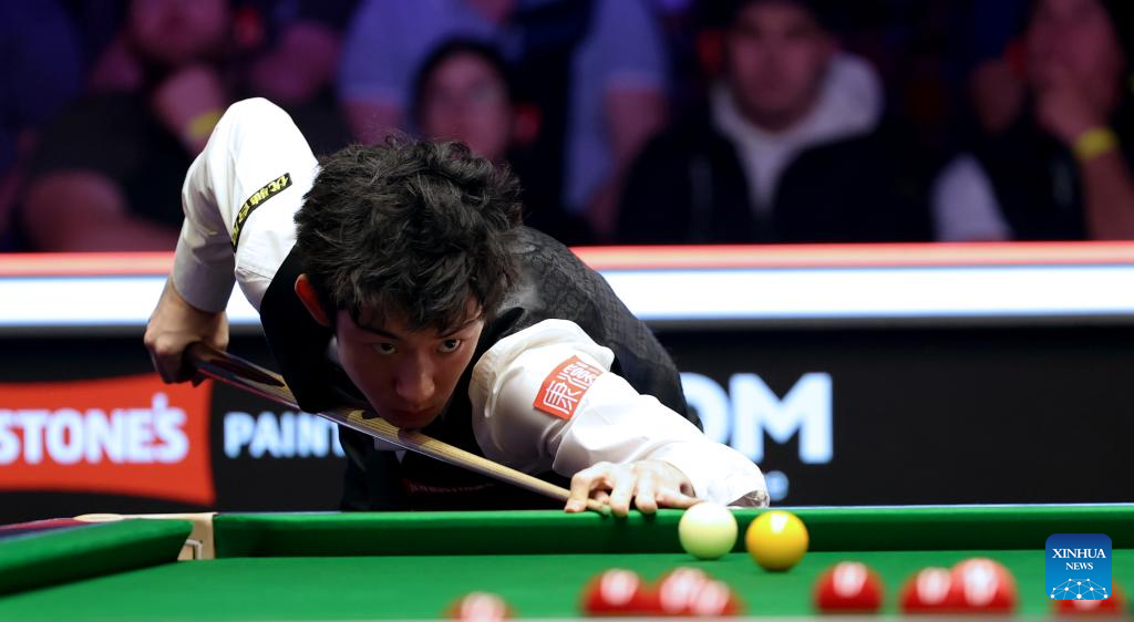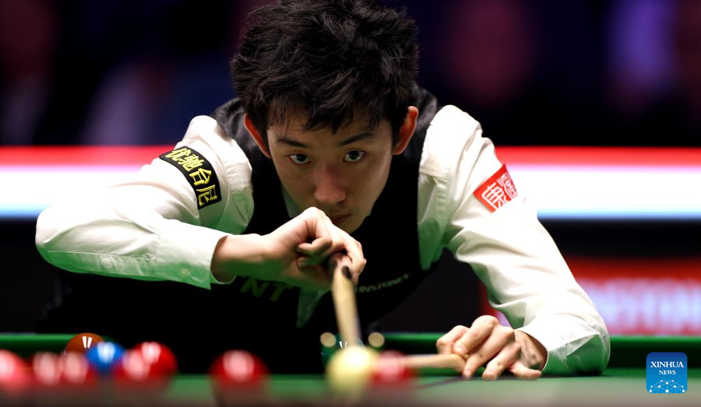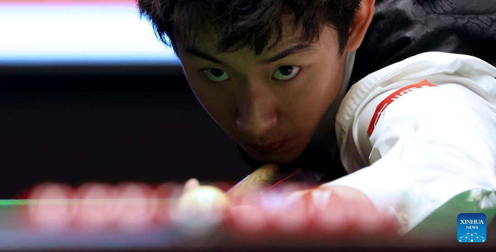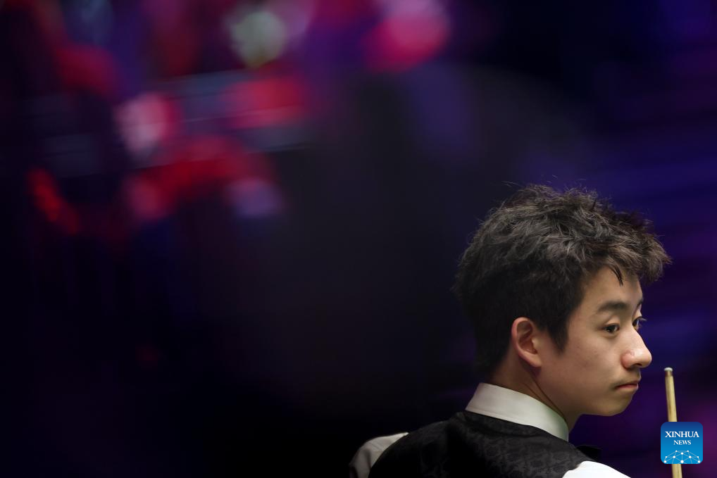 Wu Yize of China competes during the semifinal match against Kyren Wilson of England at the 2026 Snooker Masters in London, Britain, Jan. 17, 2026. (Xinhua/Li Ying)