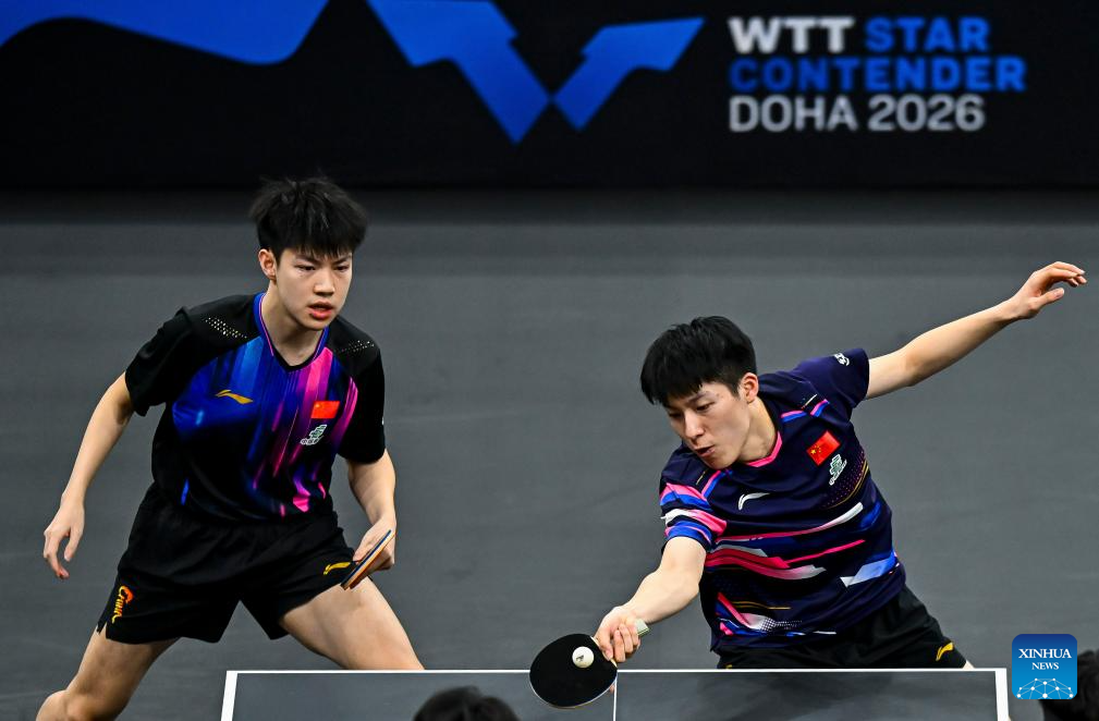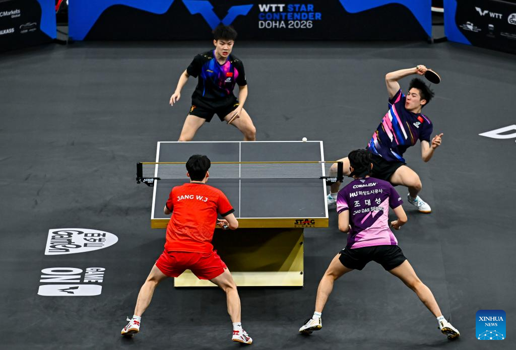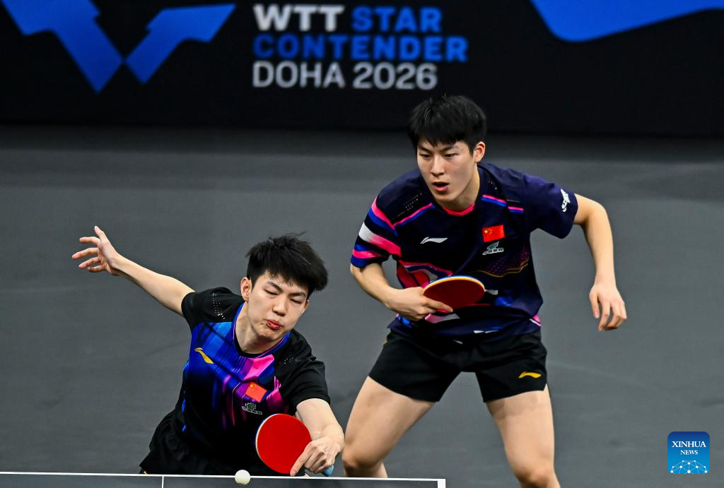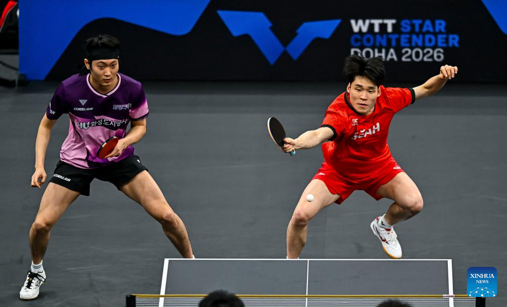 Huang Youzheng/Wen Ruibo (R) of China compete during the men's doubles final match against Jang Woojin/Cho Daeseong of South Korea at WTT Star Contender Doha 2026 in Doha, Qatar, Jan. 17, 2026. (Photo by Nikku/Xinhua)