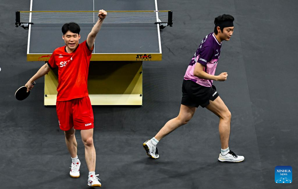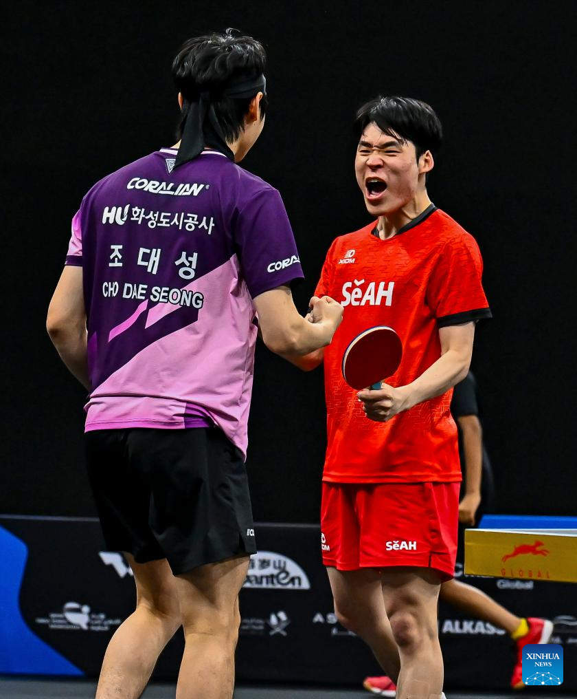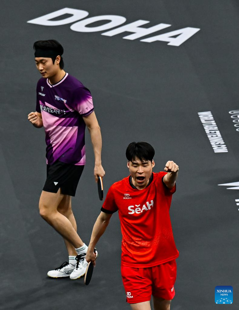Jang Woojin (R)/Cho Daeseong (L) of South Korea react after winning the men's doubles final match against Huang Youzheng/Wen Ruibo of China at WTT Star Contender Doha 2026 in Doha, Qatar, Jan. 17, 2026. (Photo by Nikku/Xinhua)