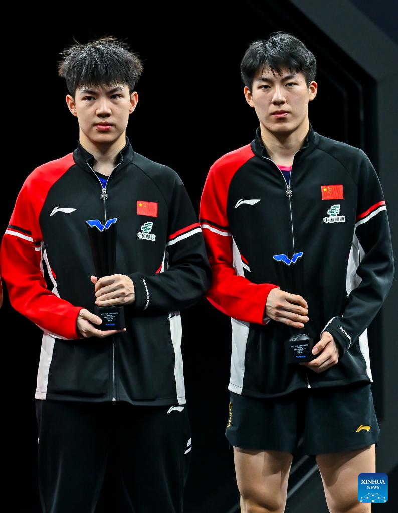 Silver medalists Huang Youzheng (L)/Wen Ruibo of China pose for photos during the awarding ceremony after the men's doubles final match against Jang Woojin/Cho Daeseong of South Korea at WTT Star Contender Doha 2026 in Doha, Qatar, Jan. 17, 2026. (Photo by Nikku/Xinhua)