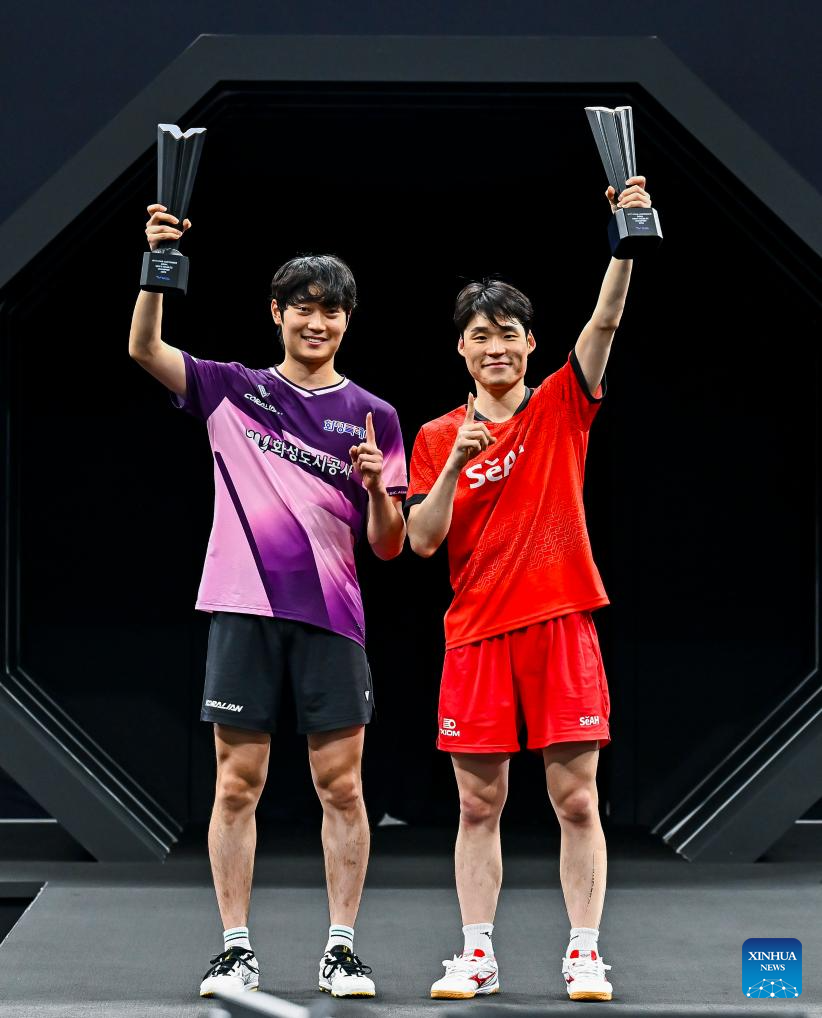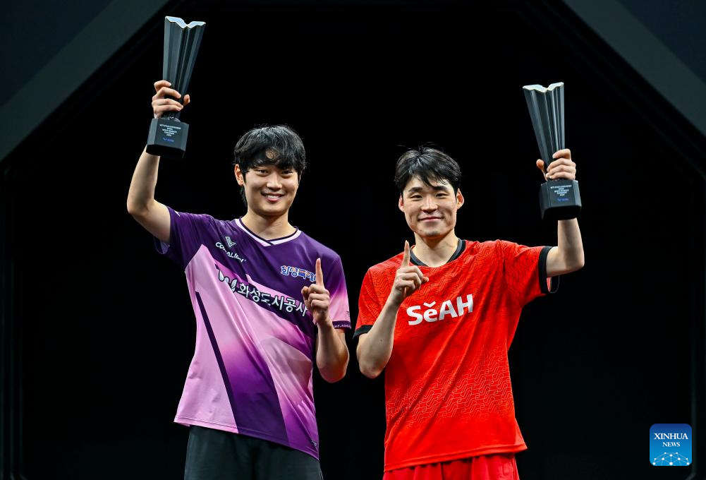 Gold medalists Jang Woojin (R)/Cho Daeseong of South Korea pose for photos during the awarding ceremony after the men's doubles final match against Huang Youzheng/Wen Ruibo of China at WTT Star Contender Doha 2026 in Doha, Qatar, Jan. 17, 2026. (Photo by Nikku/Xinhua)