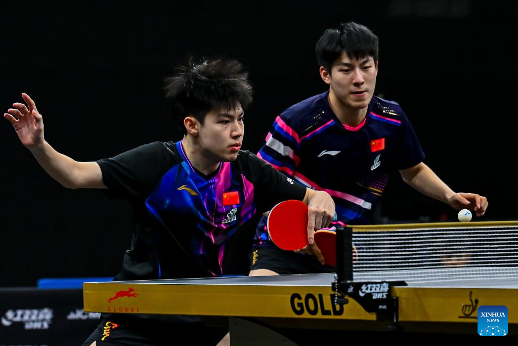 Huang Youzheng (L)/Wen Ruibo of China compete during the men's doubles final match against Jang Woojin/Cho Daeseong of South Korea at WTT Star Contender Doha 2026 in Doha, Qatar, Jan. 17, 2026. (Photo by Nikku/Xinhua)